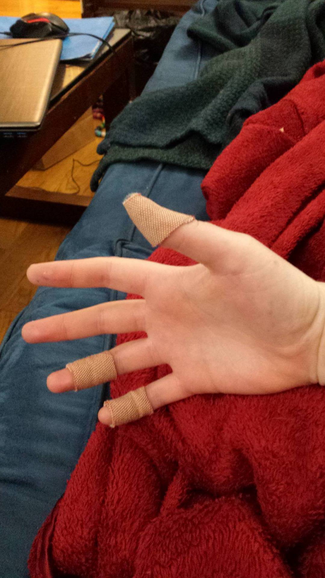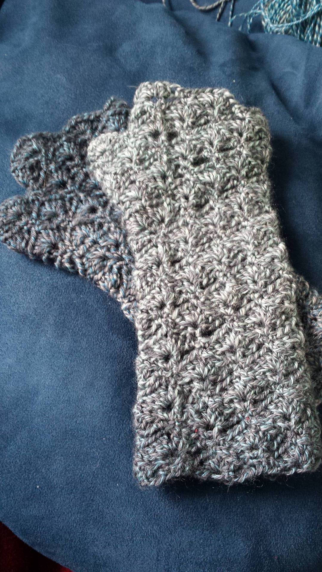 Neither photo really does the gloves justice… They’re actually a lot more blue than gray. My favorite part about them is that the gradient continues from one glove into the next and both have a good range of light and dark.