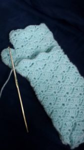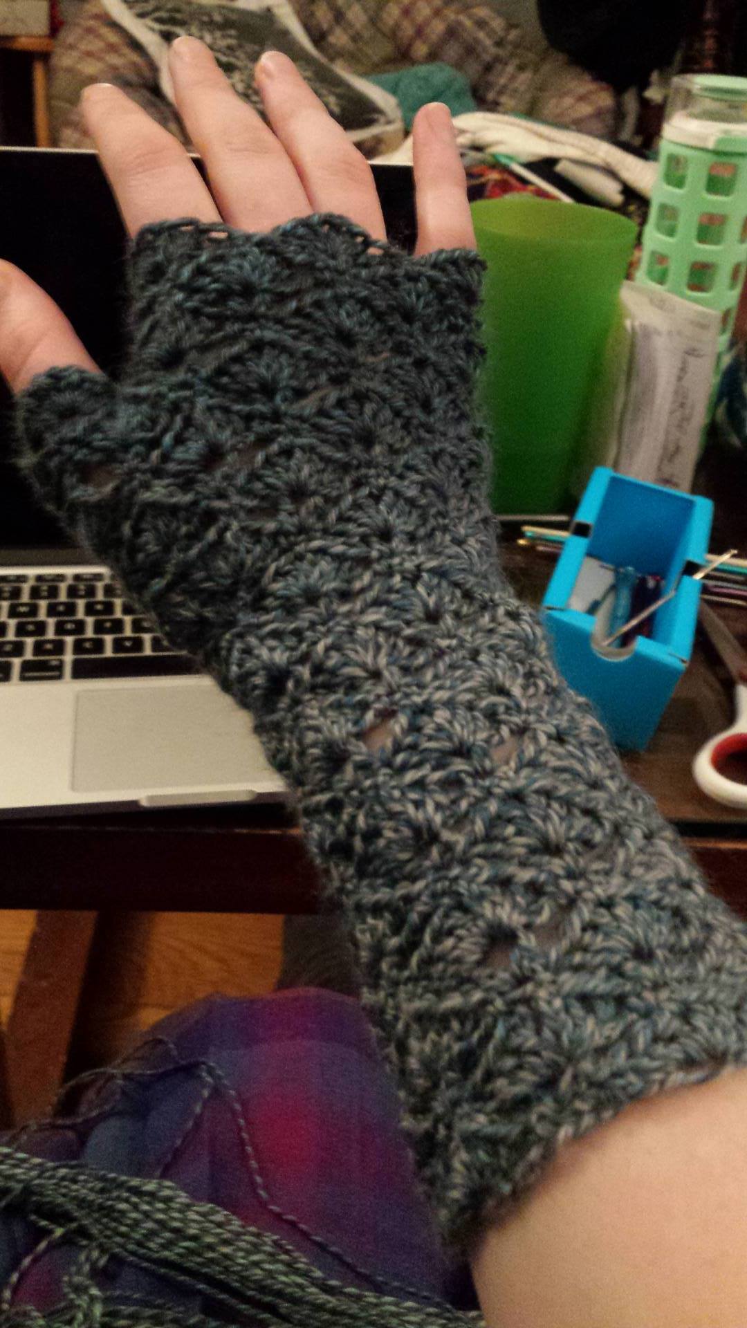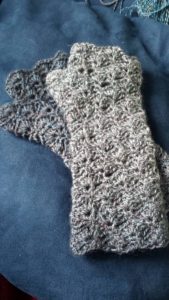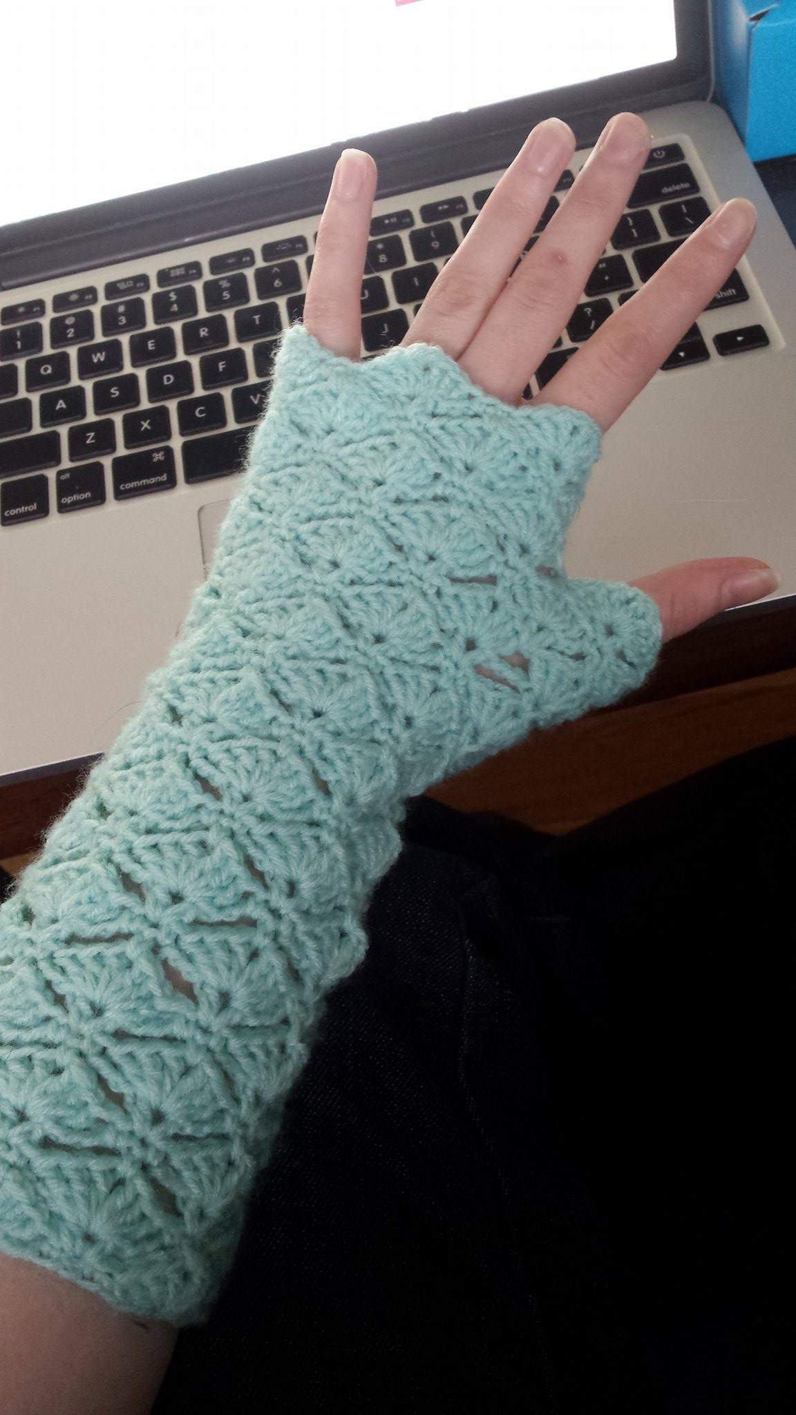 As a belated xmas gift, I crocheted a pair of super cute, lacy fingerless gloves. I’d searched for a long time for a dainty-ish fingerless glove pattern that wasn’t a complete nightmare to crochet (More on that later). I wound up on Maaike van Koert‘s Fingerless Gloves pattern from CreJJtion. The free pattern is written in three languages (Dutch, English, Spanish) with separate sections for US/UK terminology.