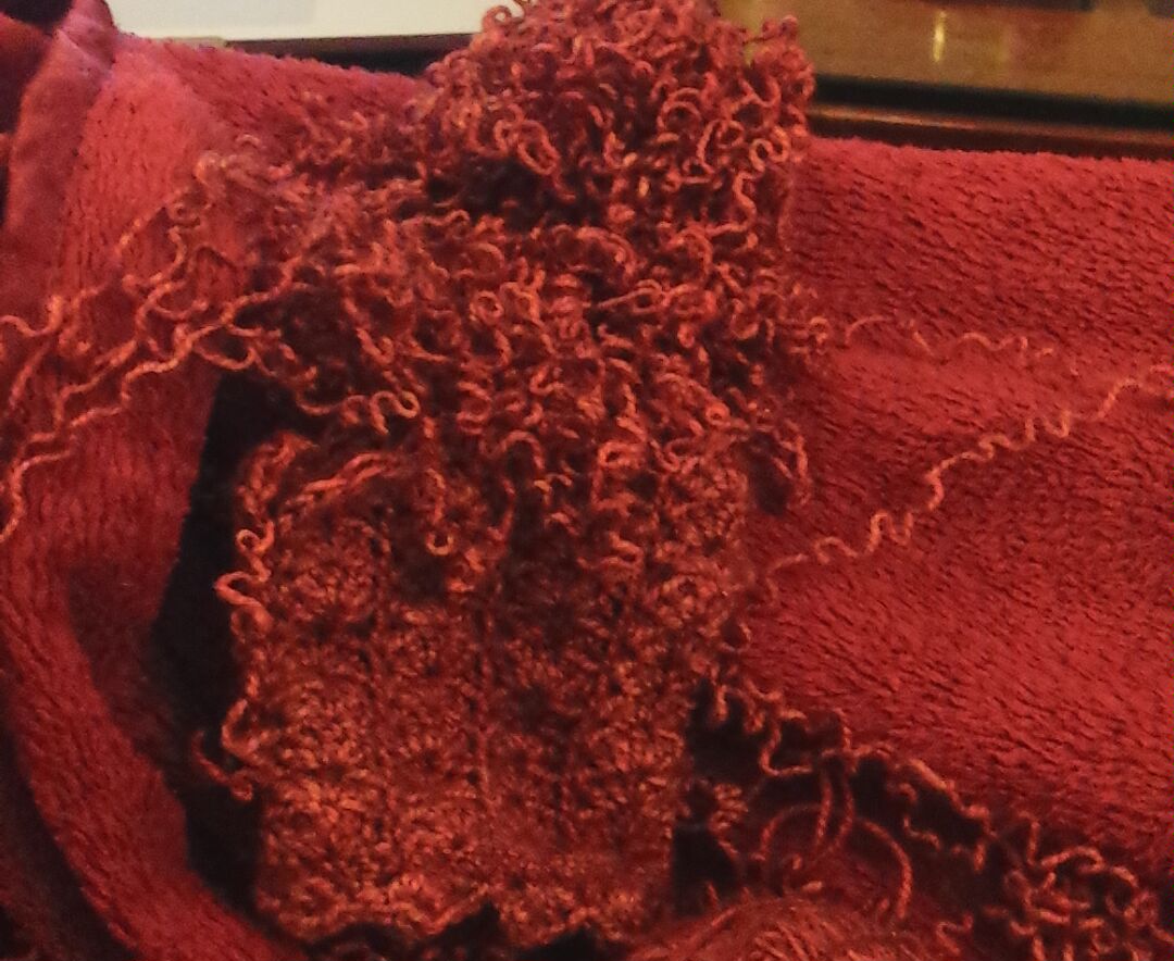 So I mentioned before that I had tried to make some lacy gloves in the past… I bought some very pretty red-orange glittery sock yarn at a craft pop-up a while back and thought it would be perfect as a pair of gloves (with the intention of them looking like the ones pictured in the post. No such luck… The gloves turned out bulky and the pattern was unpleasant to work on… I wound up with only one finished glove that spent over a year in the bottom of a pile of winter hats, waiting for me to unravel it and find something else to do.